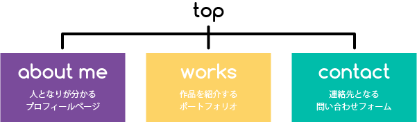 実際に仕事を依頼する場合の宛先となる「問い合わせフォーム」を加え、トップページ直下に3つのコンテンツが並ぶサイト構造にしました。